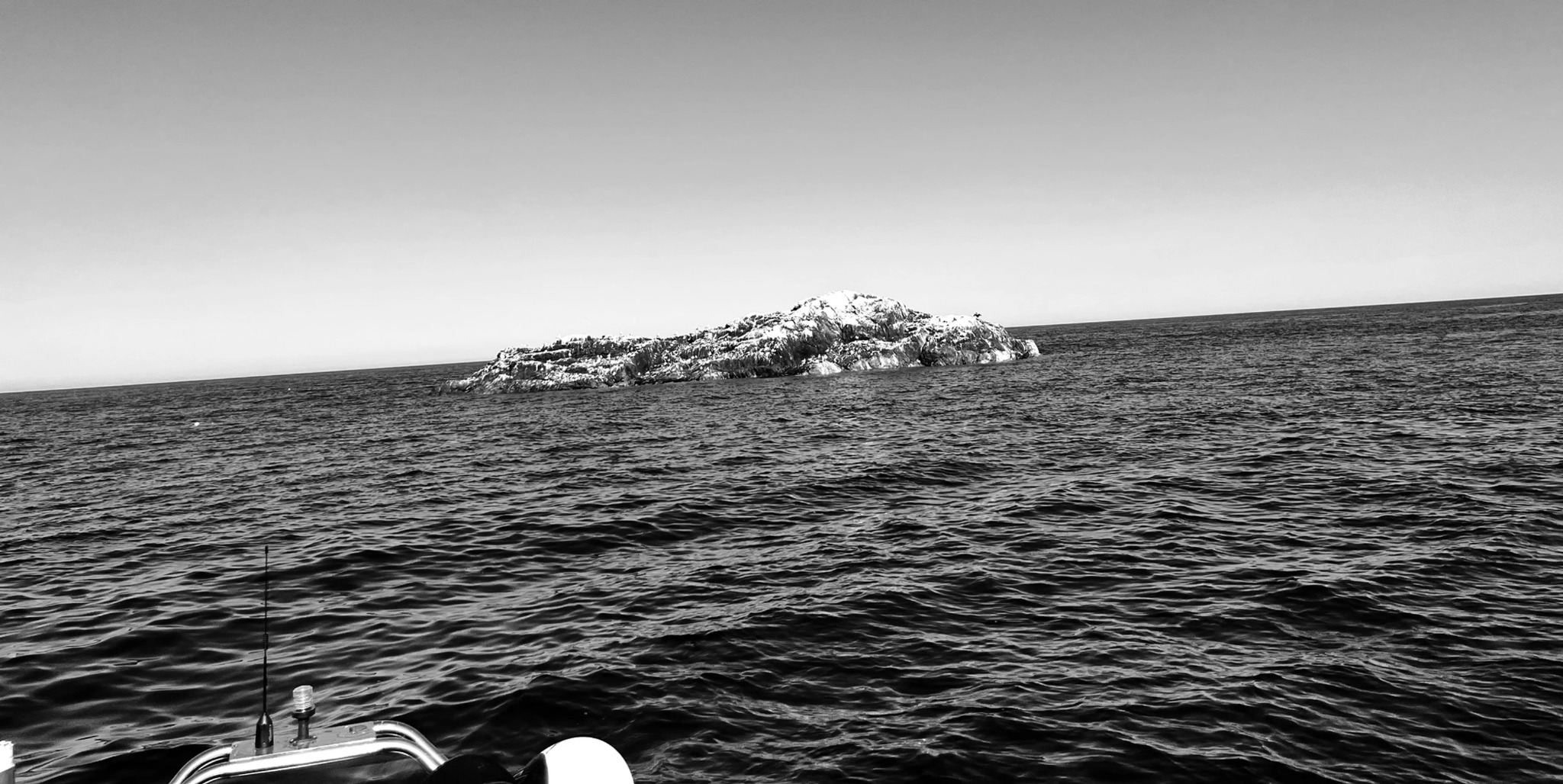 Gloved hands reach for anything fixed and the rib accelerates into crashing waves. Salt water spits and the rain pelts sharp needles onto my face. Our cox pulls down her mask so she can steer us to land, and the rest of us turn towards the engine with heads down. The rain gets heavier. Whole buckets of needles must be dropping on us now. I’d forgotten that rain could hurt. Wind echoes between the neoprene of my hood and into my ear, creating a whistling sound louder than a choir of wailing seals. Any visibility from our morning dive has been replaced with monochrome surroundings and limited visibility. All I know is that we’re blindly heading in the right direction. We make an emergency stop so our cox can re-clear her mask and set off again. We should arrive back in twenty minutes.