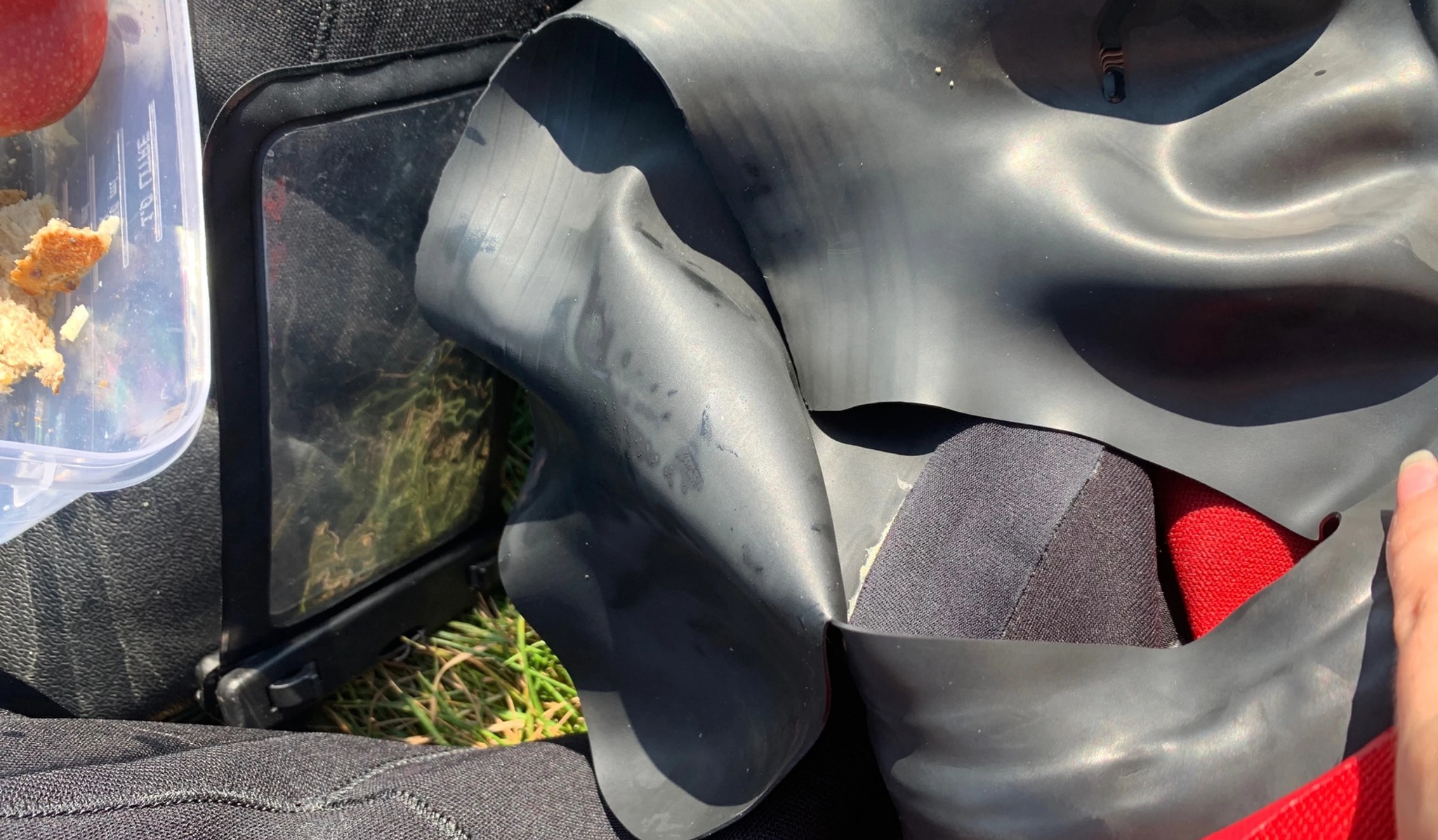 Back on the boat, we peel off our masks, hoods and gloves. We have a two hour surface interval before our next dive, so we strip down as much as we can. Neon drybags are opened, revealing suncream, water bottles and snacks. Before I eat my sandwich, I get my buddy to unzip my suit, and I tug my fingers at the latex neck seal. As I pull it over my head I feel a release in the material. My stomach sinks. With my head free, I look down at the split running along my neck seal and announce the end of my underwater adventures for today. My buddy is paired into a three, and I sip black coffee enviously as I watch everyone prepare for their second dive.